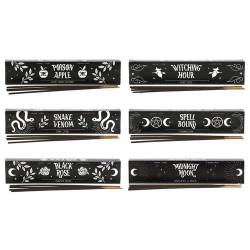 This enchanting set of six incense packs from the 'Midnight Ritual' collection features the bewitching scents of 'Poison Apple', 'Spell Bound', 'Black Rose', 'Witching Hour', 'Midnight Moon', and 'Snake Venom'. Each pack holds 15 hand-rolled sticks crafted in India with premium, vegan-friendly ingredients. Perfect for your mystical ceremonies, these incense sticks invite magic and mystery. Always burn with care, using a proper holder, and never leave them unattended.